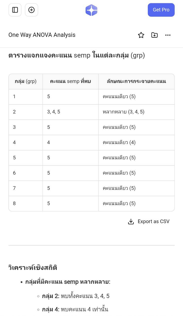 การใช้เอไอ หาค่า one-way ANOVA ด้วย prompt ารใช้เอไอ หาค่า one-way ANOVA ด้วย prompt (ChatGPT, Claude.ai, You.com, Perplexity.ai) ดังนี้ "จากแฟ้ม score52_grp_semp.csv มี first row is name of fields จงวิเคราะห์ข้อมูล เพื่อหาค่าสถิติ One-way ANOVA จากข้อมูล 52 แถว ของ 2 fields คือ grp และ semp factor = grp dependent list = semp" พบว่า ค่าสถิติ p-value และ F-Statistic ของเอไอ ตรงกับใน SPSS มีหลายตัว และพบว่า Gemini แบบฟรี ตอบว่า ข้อมูลจากไฟล์ .CSV ไม่สามารถเรียกใช้งานได้ ส่วน Copilot อธิบายขั้นตอน แต่ไม่ได้ วิเคราะห์ แล้วแสดงผลการวิเคราะห์ออกมา